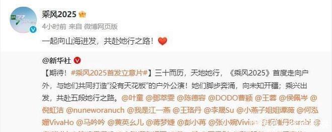 继《再见爱人》以小博大成为现象级大爆综艺后,芒果台另一档名副其实的全民综艺《乘风2025》强势回归,节目于3月19日正式官宣定档,确认从3月21日起每周五、周六更新正片与观众见面。除了宣布播出时间,节目官微还一口气放出了主题曲mv和长达50分钟的超前企划,信息量十足。